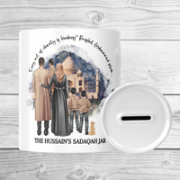 Personalised sadaqah jar customised to your family. We offer a vast amount of colours to choose from, please scroll through the pictures for example. Please note it is just one colour theme per jar.
