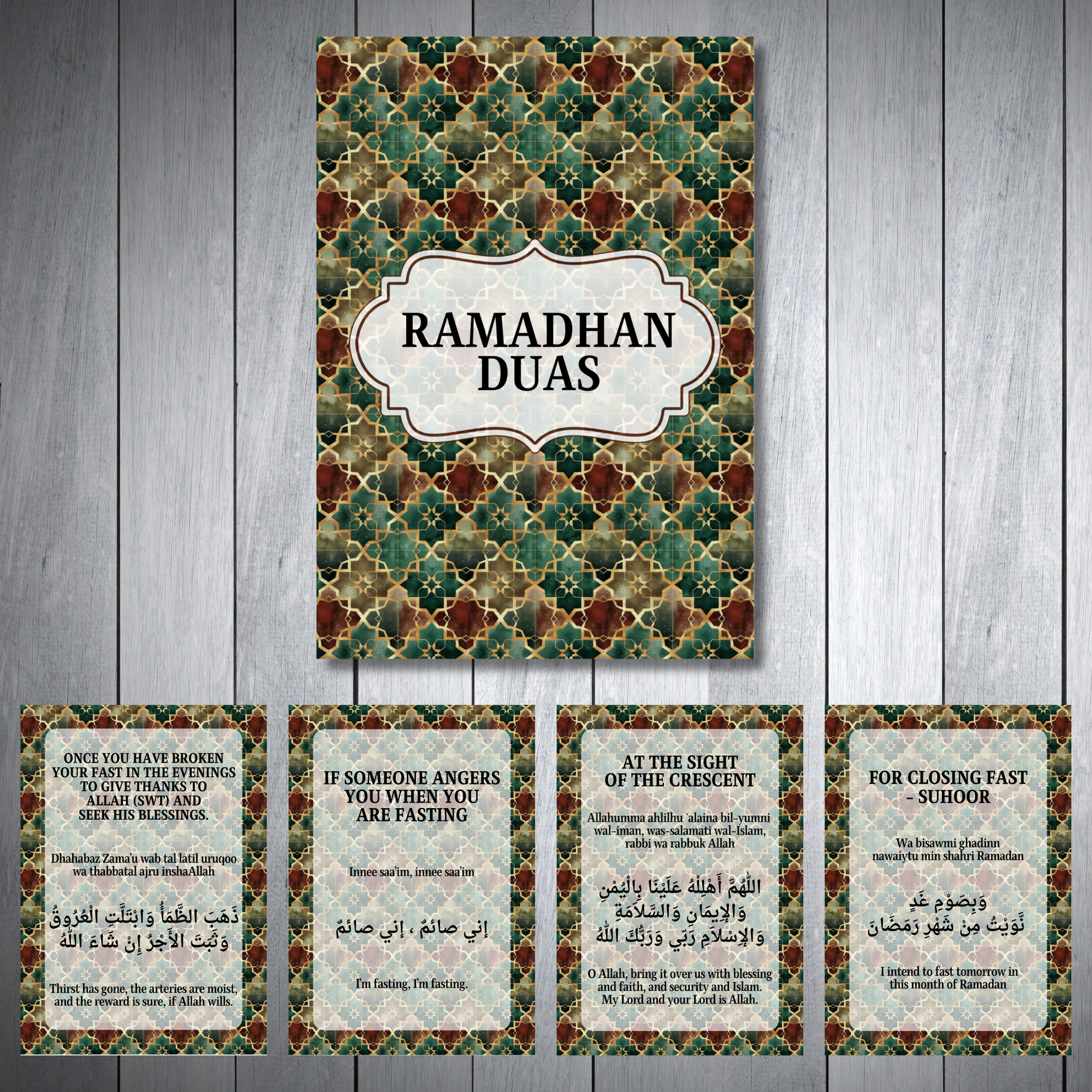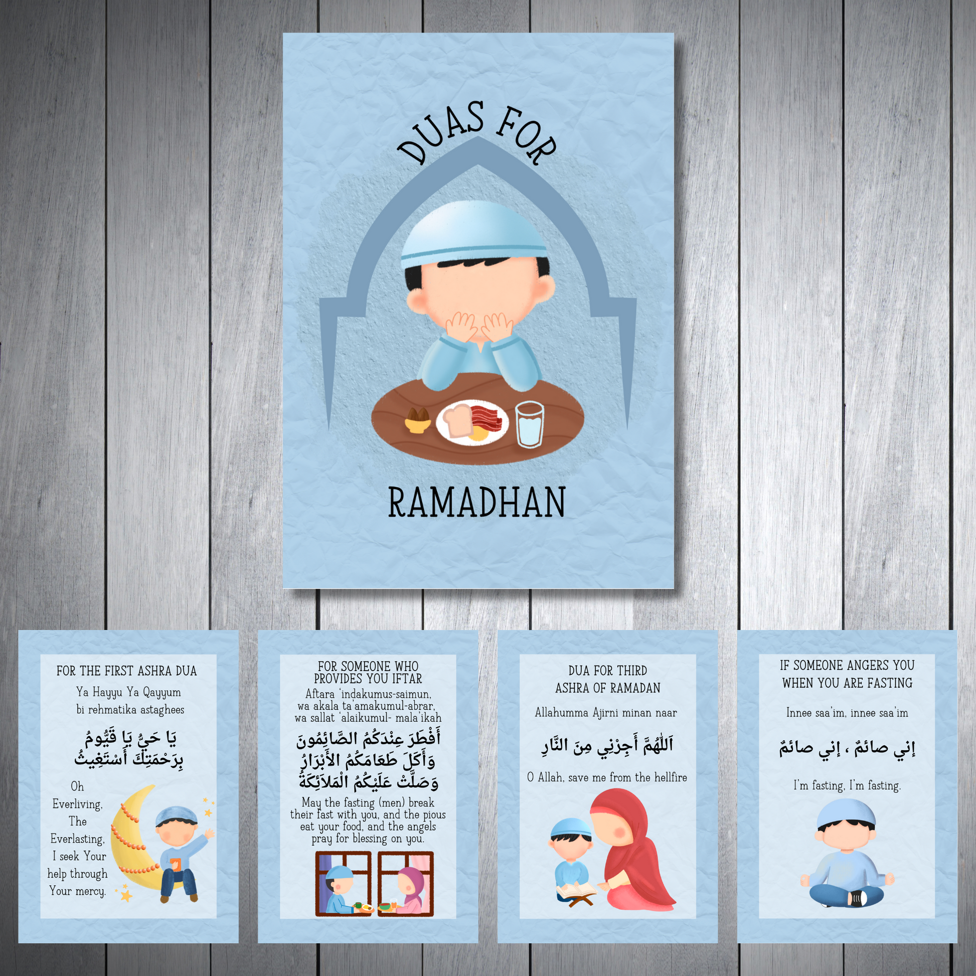 Cute set of cards printed back to front, perfect for teaching young kids and adults aswell containing 13 duas perfect for ramadhan.
