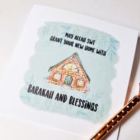 New home greetings card with the phrase may Allah swt grant your new home with barkah and blessings printed on 6by6 inch 300gsm premium linen paper. Blank inside for you to write your own message! Also available as an A5 or A4 print