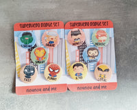 Choose between 2 sets of superheros! Each come with 5 x 25mm badges! To wear on clothing or add to your bags. Perfect little gifts for kids!